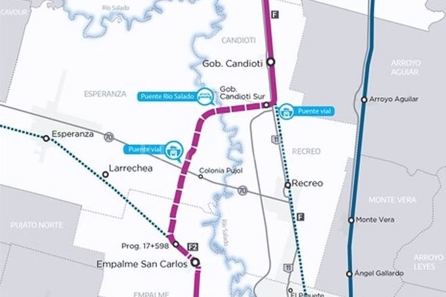 En tanto las obras del Reglón 2: Empalme San Carlos – Gobernador Candioti Oeste (15,510 km.) están a cargo de la UT (Lemiro Pablo Pietroboni S.A. - Merco Vial S.A. –Sabavisa S.A.) e incluyen obra de infraestructura nueva de vía entre Empalme San Carlos y Gobernador Candioti Oeste; Construcción de puente vial en Ruta Provincial N° 70, sobre vía férrea (El puente será ejecutado de forma tal que en el futuro, de construirse una autovía, pueda realizarse la ampliación correspondiente) y la construcción de puente ferroviario sobre el Río Salado.