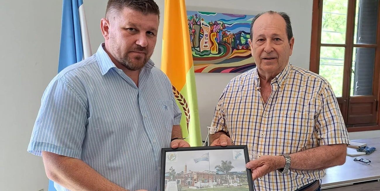 Acompañado por un grupo de colaboradores, Owen Crippa entregó un presente simbólico al intendente en reconocimiento al apoyo brindado por el municipio.