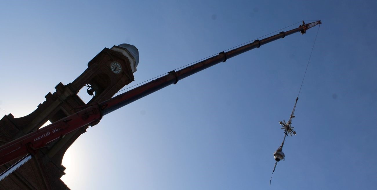 Tras 606 días de su derrumbe de la cúpula de la parroquia por una fuerte tormenta, la estructura fue reconstruida y una grúa de gran porte la subió 41 metros.