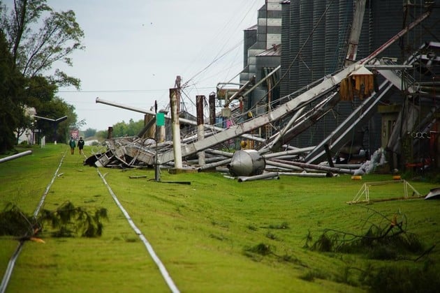 En la localidad del departamento Constitución, las imágenes más impactantes se registraron en una planta de acopio, donde la fuerza del viento derribó por completo parte de las norias, estructuras fundamentales para el movimiento de cereales.