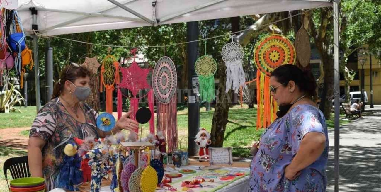 La feriante contó que en el parque Yrigoyen hay 14 emprendedores que venden tazas; correas para perros; mates de algarrobo; cactus y suculentas; marroquinería, bolsos y carteras; vestidos para muñecas; uniformes y ambos; sublimación afro y crochet, entre otros.