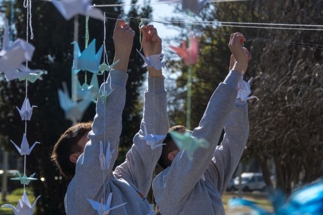 “La idea surgió en mi taller de origami cuando le conté a Claudia, que es mi alumna, la importancia que tiene la grulla plegada como símbolo de la paz, y la historia de Sadako Sasaki, una nena que fue afectada por los efectos de la bomba y sufrió leucemia por efectos de la radiación y dedicó sus últimos días de vida a hacer grullas”, cuenta Candia y recuerda que se les ocurrió proponerles la actividad a los alumnos de todos los años de las escuelas del pueblo: la Técnica N° 281, la Secundaria N° 421 y el Instituto Superior Virgen de La Merced N°9088, pero no con fines solamente artísticos, sino para invitarlos a reflexionar sobre la guerra y la violencia. “También buscamos traer el tema a lo que pasa en nuestra ciudad y en otras del país, así que los chicos trabajaron sobre la violencia, sobre la discriminación y la necesidad de tolerancia", agrega.