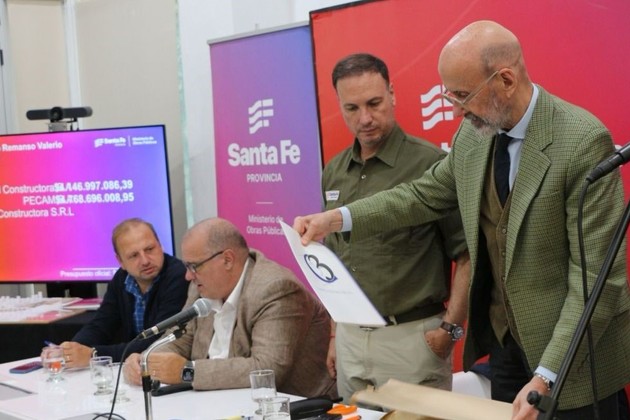 El ministro de Obras Públicas, Lisandro Enrico, encabezó la apertura de sobres de dos licitaciones públicas para el mejoramiento de viviendas e infraestructura urbana en el Parque de la Cabecera de Granadero Baigorria, departamento Rosario.