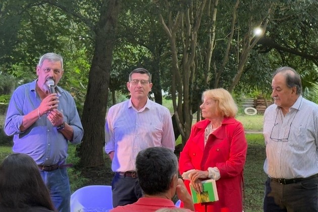 Belkys Larcher y César Bisso flanquean a Néstor Fenoglio durante su exposición. Crédito: Municipalidad de Coronda.