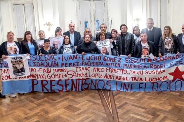 En el encuentro de este viernes que presidió Perotti estuvieron presentes Ezequiel Lowden, Ana María Cejas (mamá de Sebastián Oso Cejas); Manuela Lucero (hermana de Damián Lucero); Verónica Cerdán (mamá de Maximiliano Gómez); Carina Reinoso (mamá de Ainara Altamirano y abuela de Auriazul Morera); Florencia Faruggia (pareja de Luciano Muscio); Jésica Pintos, Javier Guzmán, Patricia Villafañe (mamá de Rocío Romano); Elizabeth Luna (mamá de Rodrigo Morra y abuela de Auriazul Morera); Esther Marín (mamá de Lautaro Aranda); Esther Iunnisi (hermana de Norberto Fabián Iunnisi); Juana Coronel (mamá de Norberto Fabián Iunnisi) y Hugo Cabrera (tío de Isaac Muñoz).