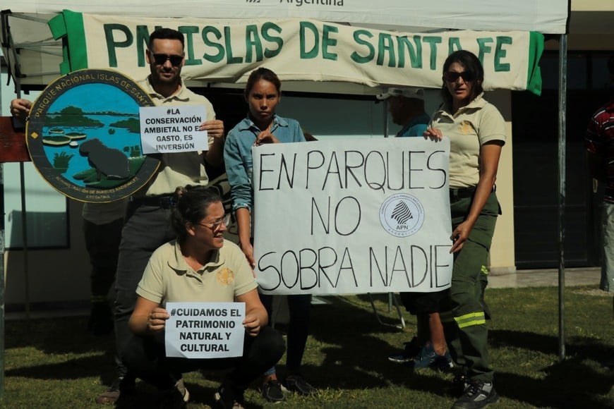 Los trabajadores se concentraron en la oficina de Puerto Gaboto, y manifestaron que “en el Parque Nacional Islas de Santa Fe, 15 de los 20 trabajadores estamos contratados bajo el Artículo Nº 9, incluyendo a personal administrativo, técnicos y brigadistas. Sin este personal no hay posibilidad de mantener un Parque Nacional ni mucho menos pensar en la conservación integral de nuestro patrimonio natural y cultural”.