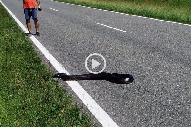 Los conductores que viajaban por la ruta provincial 1 se sorprendieron con un asombroso encuentro. Comenzaron a frenar los vehículos, incluso uno de los micros de transporte público de pasajeros, cuando se encontraron con una serpiente que se extendía unos tres metros.