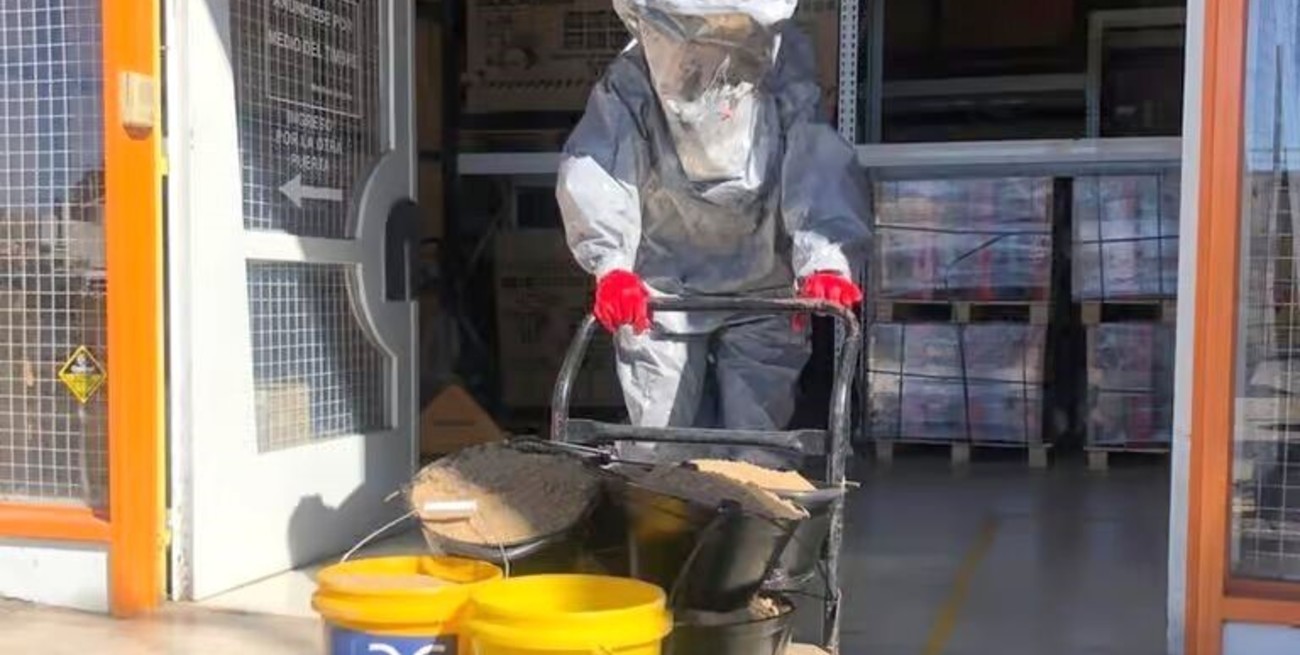 Para controlar esta situación “ingresó personal con equipo de protección química Nivel B y equipo de respiración autónoma, colocando paños absorbentes en forma perimetral y posteriormente arena seca”, señalaron. Y añadieron: “Todo el material de absorción se colocó en tachos de residuos plásticos de 200 litros debidamente cerrados”.