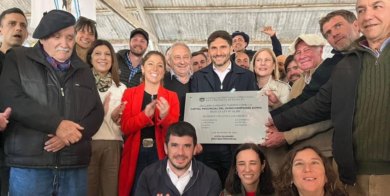 El gobernador de Santa Fe Maximiliano Pullaro, la vicegobernadora Gisela Scaglia, el intendente Leonel Chiarella y la diputada provincial Sofía Galnares recorrieron la Expo Venado, donde entregaron una placa conmemorativa en el marco de la sanción de la Ley N.º 14.382, que declara a “Venado Tuerto capital provincial del Ovino "Hampshire Down” en reconocimiento a la calidad genética de los cabañeros del sur santafesino y en alusión a los primeros pobladores de esta zon