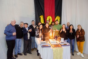 Gran festejo: la torta y el brindis por los cien años, con los actuales y antiguos protagonistas.