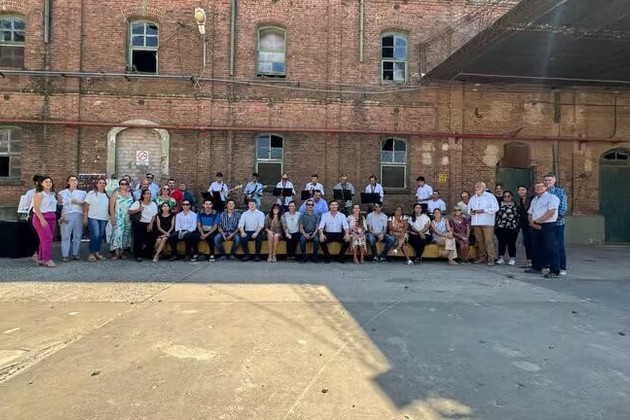 El jefe de Gabinete, Arturo Patimo, el intendente Natalio Latanzzi y todo el Ejecutivo Municipal presenciaron el acto histórico de cesión, enmarcado en el fondo rojo de ladrillos vistos del edificio con más historia productiva y emprendedora de la gesta local.