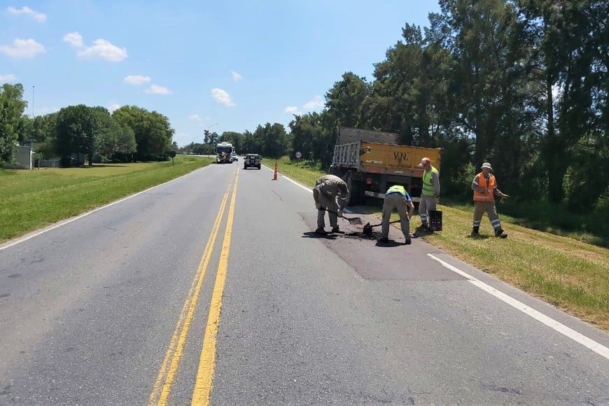 Una cuadrilla repara el asfalto a la altura del km 612 de Colonia Silva, al norte de la ciudad de San Justo. Crédito: Prensa VN