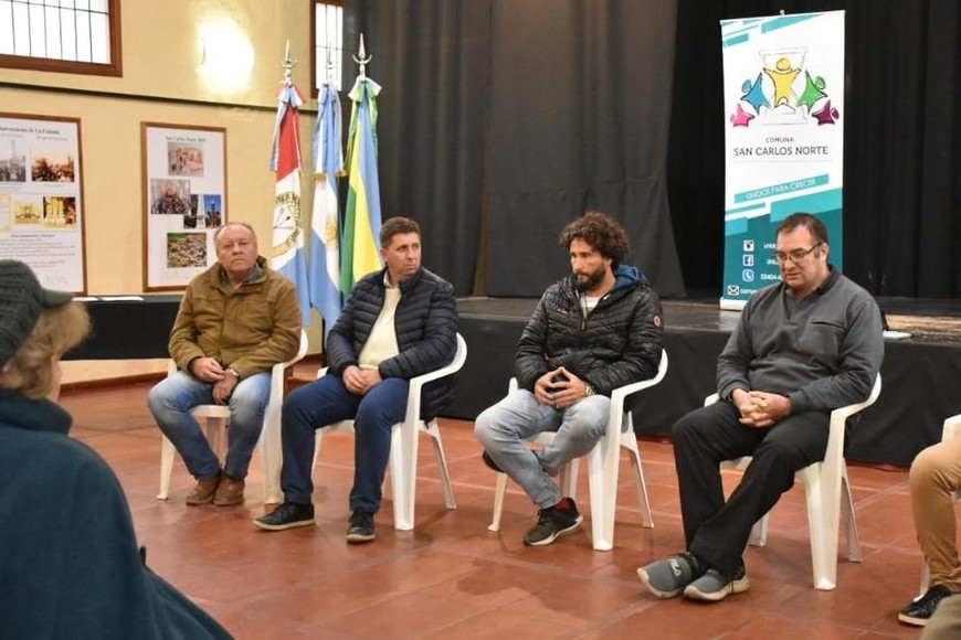 De la firma del convenio formaron parte el presidente comunal Víctor Cavallero, Cristian Osta por la comuna de San Agustín, el senador provincial Rubén Pirola, el Subsecretario de Infraestructura Rural y Magíster en Agronegocios, Matías Giorgetti, productores agropecuarios e integrantes de la comunidad educativa de San Carlos Norte.