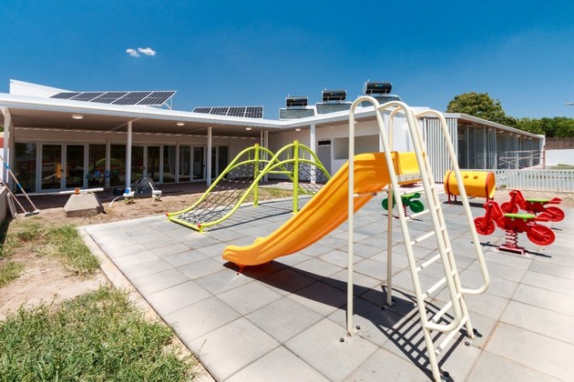 Los jardines se desarrollan en planta baja con espacios destinados al nivel inicial con secciones para 3, 4 y 5 años. La capacidad es para 80 niños por turno.