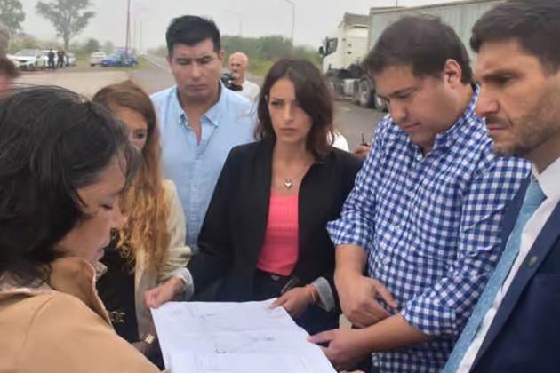 Recorriendo la defensa. La diputada Galnares, el coordinador regional Vergé, la senadora Di Gregorio, el gobernador Pullaro, el ministro Enrico y la presidente comunal Gallisso.