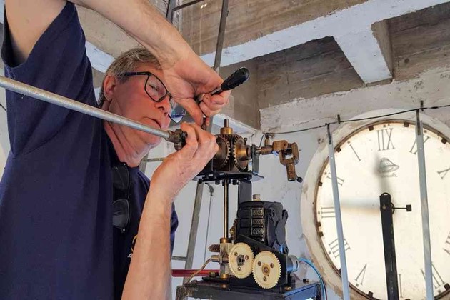 El impacto del primer vistazo al subir a la torre de la Parroquia no fue el mejor. El estado de la máquina electromecánica que reemplazaba al original sistema era “deplorable”. Luego de una minuciosa evaluación y posterior reunión con el cura de la ciudad, se determinó llevar adelante la reparación. Pero para eso, debían hacer trabajos previos. “Primero tenían que arreglar el sector de ascenso hasta el habitáculo donde se encuentra el reloj, ubicado a 27 metros de altura. Y luego, una vez allí, debían colocar un piso para hacer las tareas”, contó Peretti. Es que en la habitación donde descansaba el sistema, sólo existía una superficie que sostenía la maquinaria al mejor estilo isla y, alrededor, únicamente había vacío. “Era mucho el peligro de caer”, remarcó.