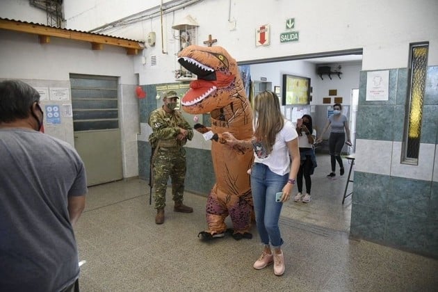 Un joven sorprendió este domingo en Rosario, en el marco de las elecciones generales 2021. Llegó a la Escuela Santa Isabel de Hungría -Cafferata 4070, en el sudoeste de la ciudad- disfrazado de dinosaurio.