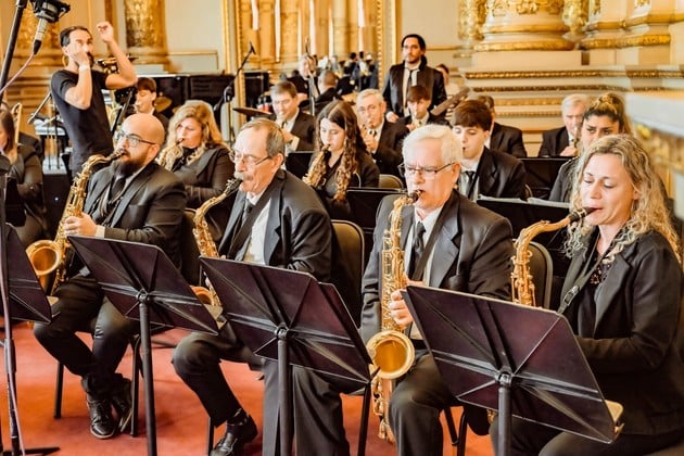 La grabación se realizó en el imponente Salón Dorado del Teatro Colón, donde los integrantes del Programa Intercomunal de Bandas Civiles Comunitarias desplegaron su talento en una interpretación de gran sensibilidad y excelencia técnica.