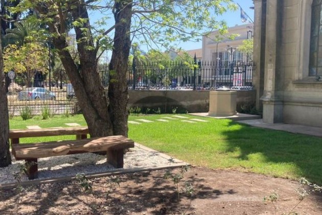 Vista de los jardines del templo católico, con el primer cinerario del sur-sur provincial.