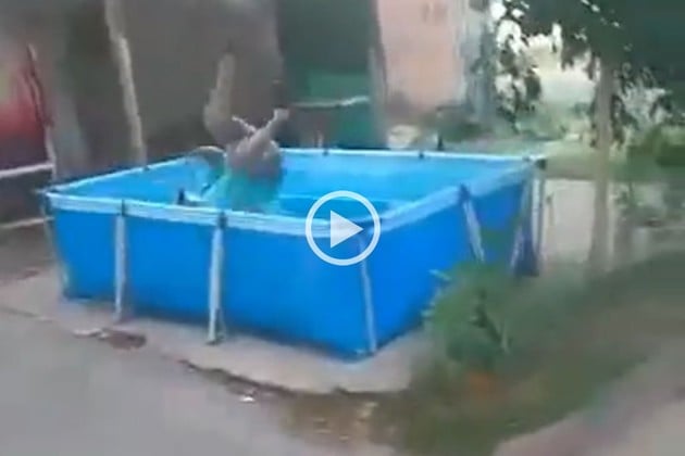 Las imágenes muestran al trabajador de la ciudad del sur santafesino tirarse a una pileta de plástico montable ubicada en la vereda de una casa. El hombre se zambulle y rápidamente sale para continuar con su labor, pero ahora refrescado.