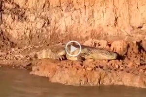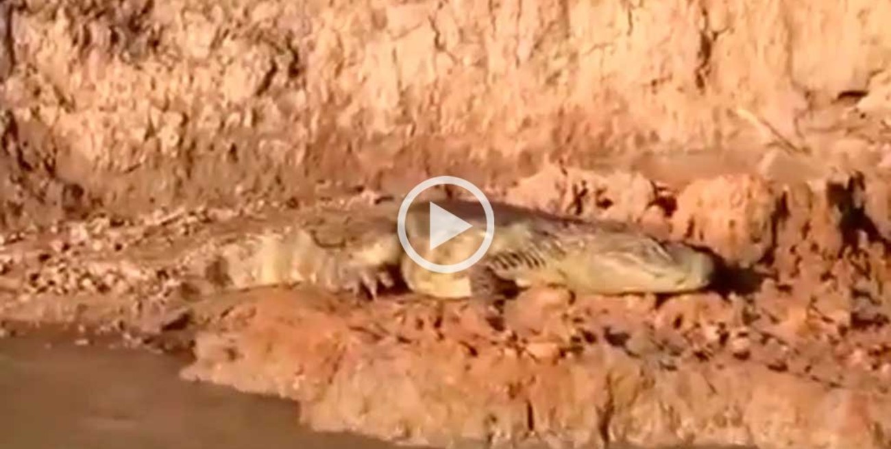 La secuencia fue filmada por uno de los ocupantes de la embarcación que captó el momento exacto en que el reptil nota la presencia humana y se altera. Acto seguido, se enfrenta al bote y se pierde entre las aguas del río.