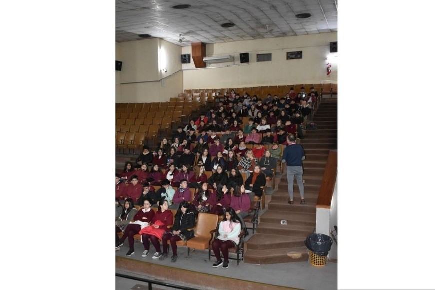 Appa en el Teatro Hispano de Rufino, durante una charla para alumnos de nivel medio.