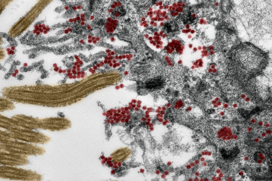 Charité Sección de una célula de la mucosa olfativa vista al microscopio electrónico se observan en rojo las partículas del coronavirus (el color no es real).