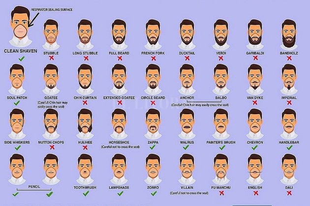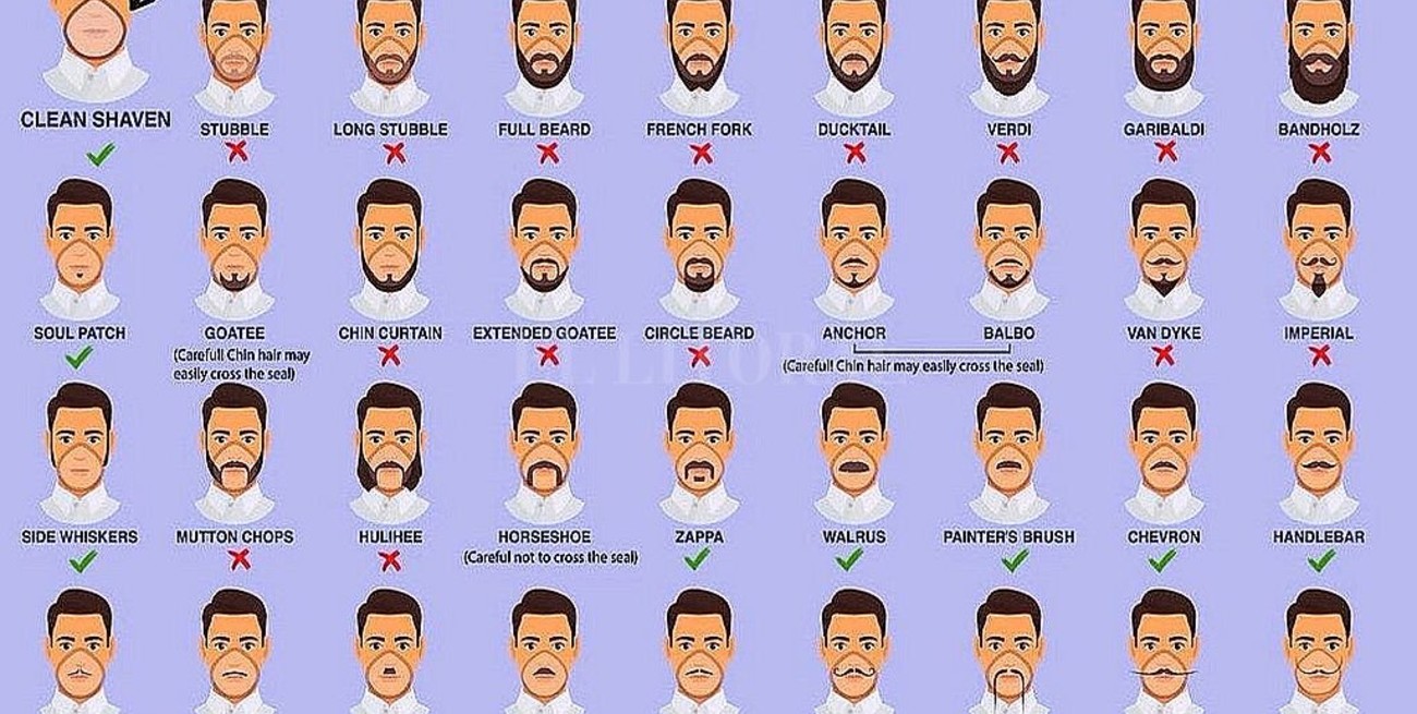 El vello facial representa un riesgo para la efectividad de los respiradores porque puede evitar que la válvula de exhalación funcione correctamente si los dos entran en contacto, según la infografía. No importa la elección del estilo, el cabello no debe cruzar la superficie de sellado del respirador, según la infografía. Una barba estilo perilla, una herradura y un bigote de villano están bien, con precaución, señalaron.