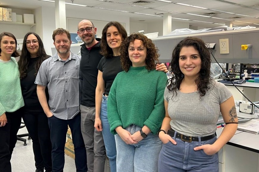 Primer autor del estudio, Sebastián Giusti, con investigadoras de Neurobiología Molecular del Instituto de Investigación en Biomedicina de Buenos Aires (IBioBA). Gentileza: IBioBA.