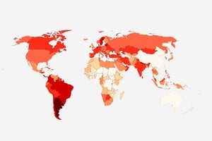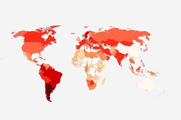 Argentina, con 54 casos cada 100 mil personas, está pintada de bordó -uno de los colores más intensos-. Sólo es superada por Uruguay, que tuvo 88 casos cada 100 mil habitantes en los últimos días y aparece pintado de un tono oscuro, casi negro. En tanto, India, también es uno de los países que preocupa al mundo por la curva acelerada de contagios que registró en las últimas semanas, tiene 21 casos cada 100 mil habitantes.
