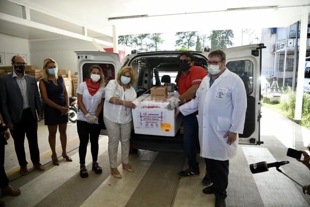 La distribución en la Argentina será de acuerdo a un cociente basado en cantidad de médicos y centros de salud habilitados. Provincia de Buenos Aires recibirá 123 mil vacunas, Santa Fe 24.100, Ciudad de Buenos Aires 23.100, Córdoba 21.900, Tucumán 11.500, Mendoza 11 mil, Entre Ríos 10.100, Salta 8.300, Chaco 7.700, Corrientes 6.700, Santiago del Estero 5.900, Misiones 5.200, San Juan 4.700, Jujuy 4.600, Río Negro 4.400, Neuquén 3.600, Formosa 3.400, San Luis 3.300, Chubut 3.000, Catamarca 2.800, La Rioja 2.600, Santa Cruz 2.400, La Pampa 2.300 y Tierra del Fuego 1.300.