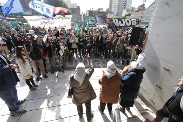 La expectativa era muy grande en la sede del Tribunal, ubicado en el microcentro santafesino, donde se congregó mas de un centenar de personas que cortaron la calle Primera Junta, portando banderas y pancartas de Madres de Plaza de Mayo, agrupaciones Hijos y Nietas, los gremios ATE y Amsafe, Agrupación Evita, Frente Estudiantil de Trabajo Social, Asociación Ex presos Políticos, Verdad y justicia por Silvia Suppo, entre otros.