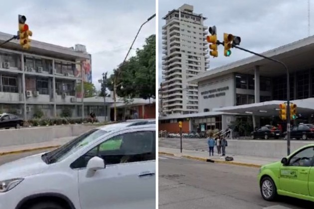 El semáforo de Hipólito Yrigoyen se mantiene en color rojo de forma constante y lo mismo sucede con el de calle Belgrano, pero en verde.
