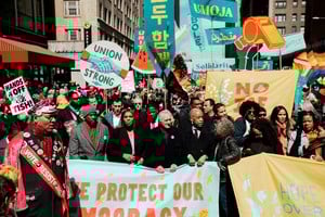 Miles de activistas colmaron Times Square y marcharon hasta Central Park, donde De Niro pronunció un enérgico discurso en el que calificó a Trump como “diabólico” y lo acusó de enriquecerse a costa de los ciudadanos estadounidenses.