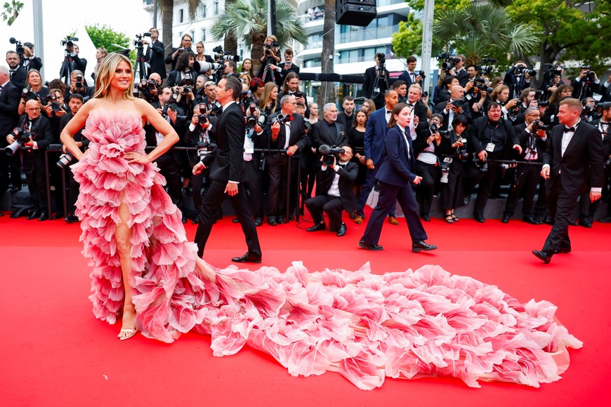 Heidi Klum, ¿no recibió el dress code de la gala? Si bien la actriz eligió un romántico y primaveral modelo del diseñador libanés Elie Saab, rompió con la consigna de nada voluminoso ni colas largas. El vestido lleno de texturas que forman pétalos y flores, y que desciende con más de un metro de largo detrás de la Klum, no siguió las normas de esta edición del festival.