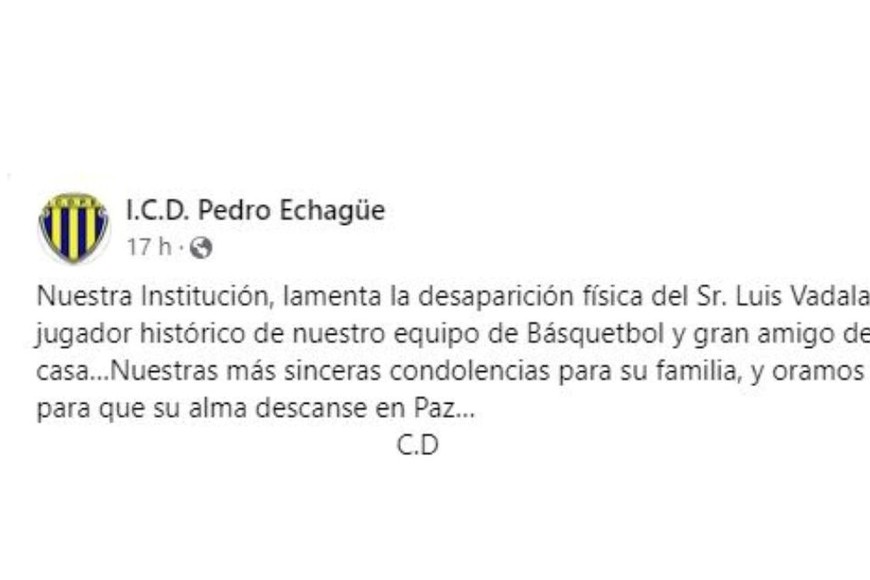 “Nuestra institución lamenta la desaparición física del SR. Luis Vadalá, jugador histórico de nuestro equipo de Basquetbol y gran amigo de la casa...Nuestras más sinceras condolencias para su familia y oramos para que su alma descanse en Paz”, escribieron desde el club.
