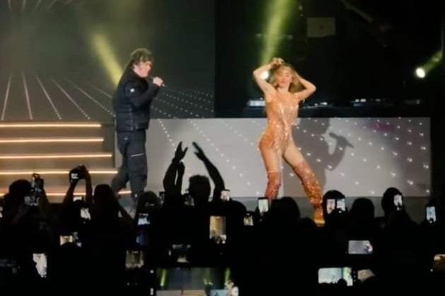 Tal como había hecho en 2024, a poco de haber asumido, el presidente cumplió un doble objetivo: acompañó a su ex pareja y se dio el gusto de volver a subirse a un escenario para cantar.
