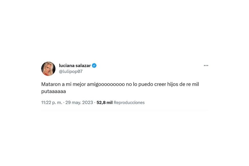 Minutos antes de la medianoche de este lunes, Salazar escribió en su cuenta de Twitter: “Mataron a mi mejor amigo, no lo puedo creer hijos de re mil puta”. De inmediato, la modelo borró el tuit.