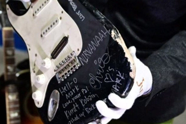 Anteriormente, la casa de subastas había especificado que la guitarra, una Fender Stratocaster negra, había sido reconstruida y ya no podía usarse para tocar música. Sin embargo, conserva las inscripciones realizadas por los tres miembros de Nirvana: Kurt Cobain, Krist Novoselic y Dave Grohl.