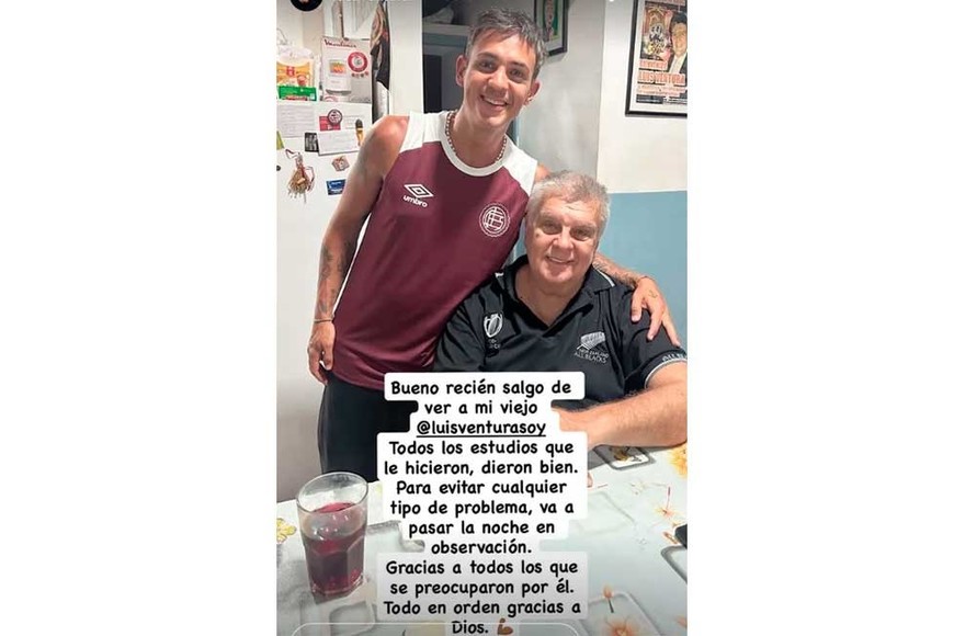 “Bueno, recién salgo de ver a mi viejo @luisventurasoy. Todos los estudios que le hicieron, dieron bien. Para evitar cualquier tipo de problema, va a pasar la noche en observación. Gracias a todos los que se preocuparon por él. Todo en orden, gracias a Dios”, escribió junto a una imagen de ambos.