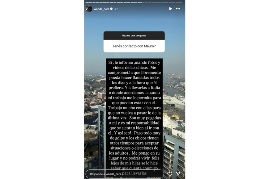Durante una ronda de preguntas en Instagram, un seguidor le consultó: “¿Tenés contacto con Mauro?”. Con sinceridad, Wanda respondió que sí: “Le informo, mando fotos y videos de las chicas. Me comprometí a que libremente pueda hacer llamadas todos los días y a la hora que él prefiera, y a llevarlas a Italia o donde acordemos, cuando mi trabajo me lo permita para que puedan estar con él”.