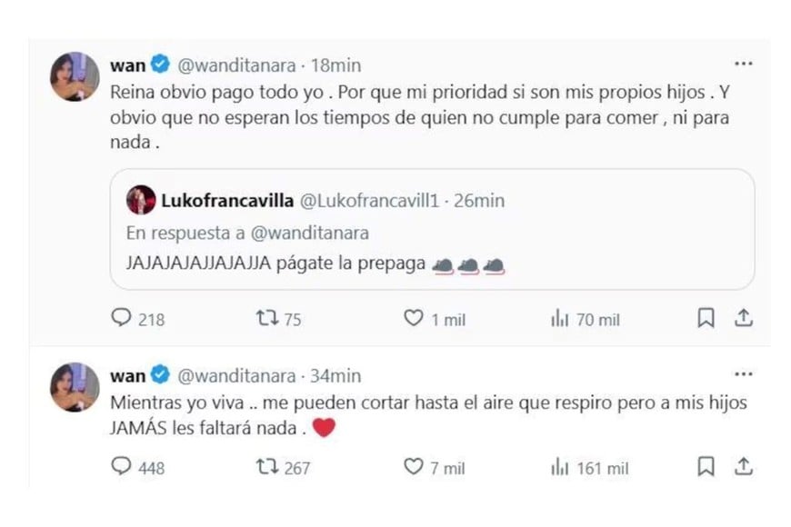 La publicación generó todo tipo de reacciones. Una usuaria, de forma irónica, le escribió: “Jajajajajaja, pagate la prepaga” junto a varios emojis de ratas. Lejos de esquivar la polémica, Wanda respondió con firmeza: “Reina, obvio que pago todo yo. Porque mi prioridad son mis propios hijos. Y obvio que no esperan los tiempos de quien no cumple para comer, ni para nada”.