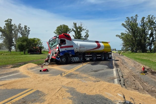 Uno de los vehículos de gran porte es un cisterna y transportaba combustible y el otro iba cargado con soja y entraron en colisión por circunstancias a determinar.