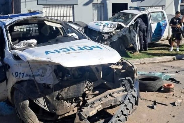 Uno de los móviles avanzaba por la calle Armonía, mientras que el otro lo hacía por López May. Al llegar simultáneamente al cruce, los vehículos no lograron frenar a tiempo y colisionaron de manera violenta en la esquina. El impacto fue tan fuerte que uno de los patrulleros terminó volcado, mientras que el otro se desvió y chocó contra un automóvil que se encontraba estacionado en las inmediaciones.
