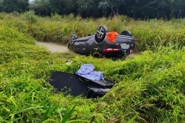 Como consecuencia del impacto, el automóvil perdió el control, salió de la calzada y terminó en la banquina, donde colisionó contra un cartel de señalización vial.