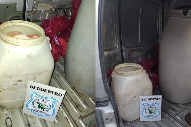 Al acercarse, los agentes pudieron ver que había dos tachos azules que contenían todo tipo de achuras al costado del vehículo de mayor porte marca Scania y adentro del otro rodado Renault Kangoo ya estaban cargados otros dos baldes grises y bolsas rojas también con vísceras bovinas.
