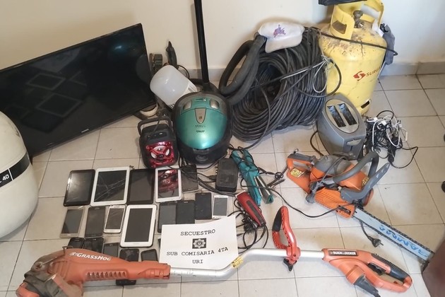 La policía no encontró entonces al hombre -arrestado este martes-, pero sí halló muchos de los artículos que habían sido denunciados como sustraídos desde fincas vecinas: una bordeadora, un televisor de 32 pulgadas, 14 celulares, 5 tablets, 2 parlantes, un filtro de piscina, una aspiradora, 50 metros de cable, una plancha para pelo, un decodificador, un par de zapatillas, una lijadora, una cortadora de pelo, una motosierra, una tostadora y una garrafa, entre otros.