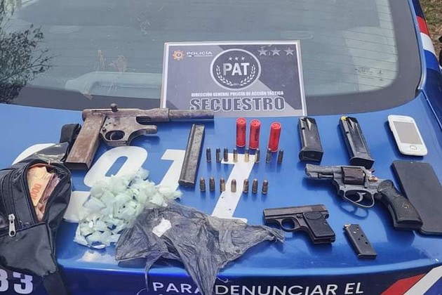 En una mochila, llevaba un revólver calibre .32 largo, una ametralladora calibre .22 y una pistola calibre 6,35 (todos los armamentos con cartuchos intactos y el primero con algunos percutados), cargadores calibre 9 mm con municiones en sus almacenes, varios envoltorios con una sustancia pulverulenta blanquecina similar a la cocaína, dos teléfonos celulares y dinero.