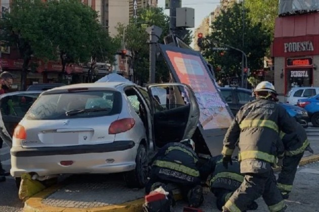 Un Peugeot 206 arremetió contra un cartel y una columna. Fue en el cruce de las Avenidas Rivadavia y Pueyrredón.