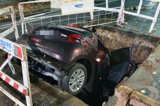 El vehículo, un Peugeot de color oscuro, se cayó a la excavación este sábado. Por la profundidad del pozo, apenas se pudo divisar el coche. Personal de Tránsito acudió al lugar para asistir y colaborar con el tráfico. El auto permaneció toda la noche del sábado en el pozo. El conductor del vehículo logró salir por la puerta trasera derecha tras caer en la fosa.